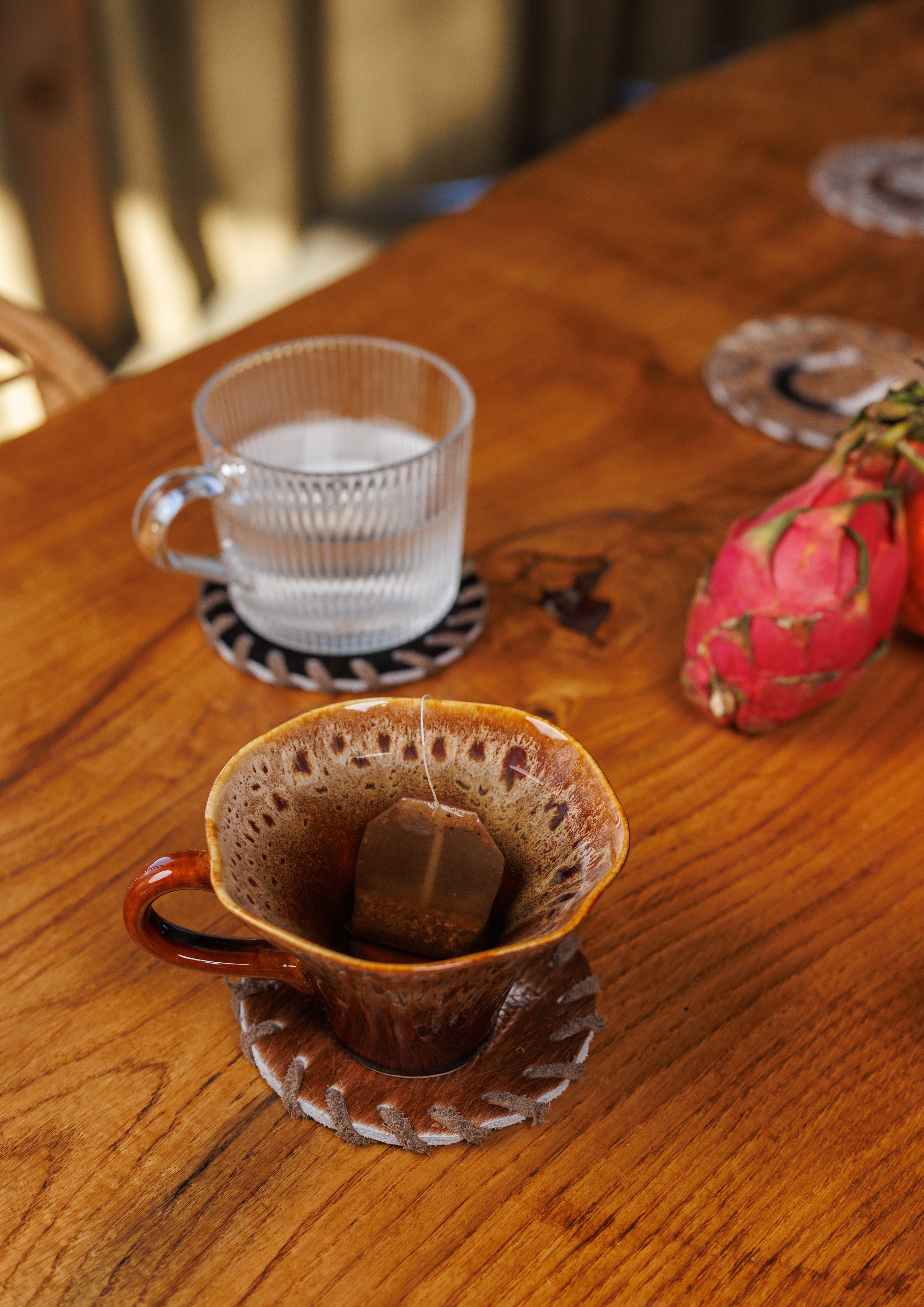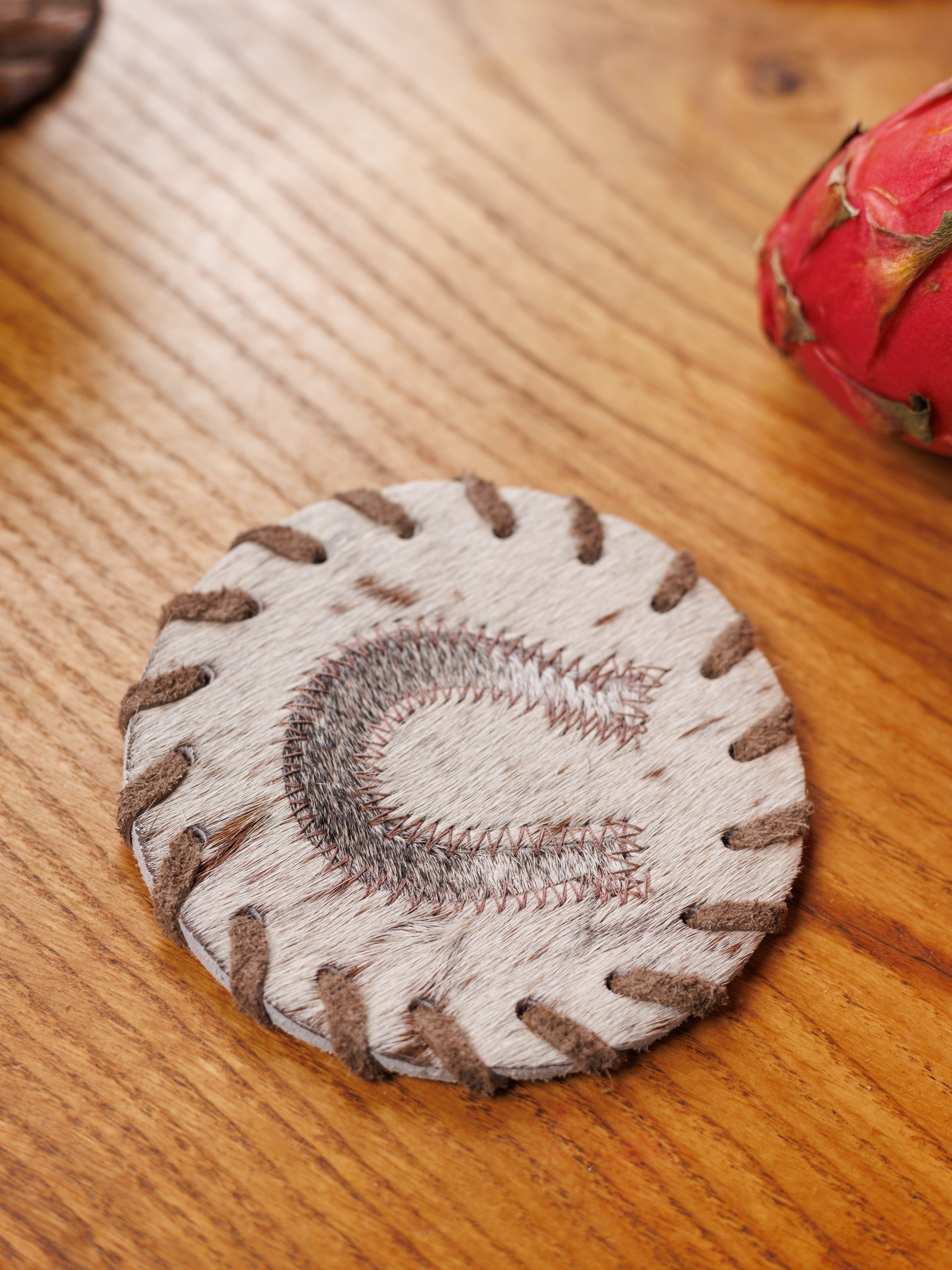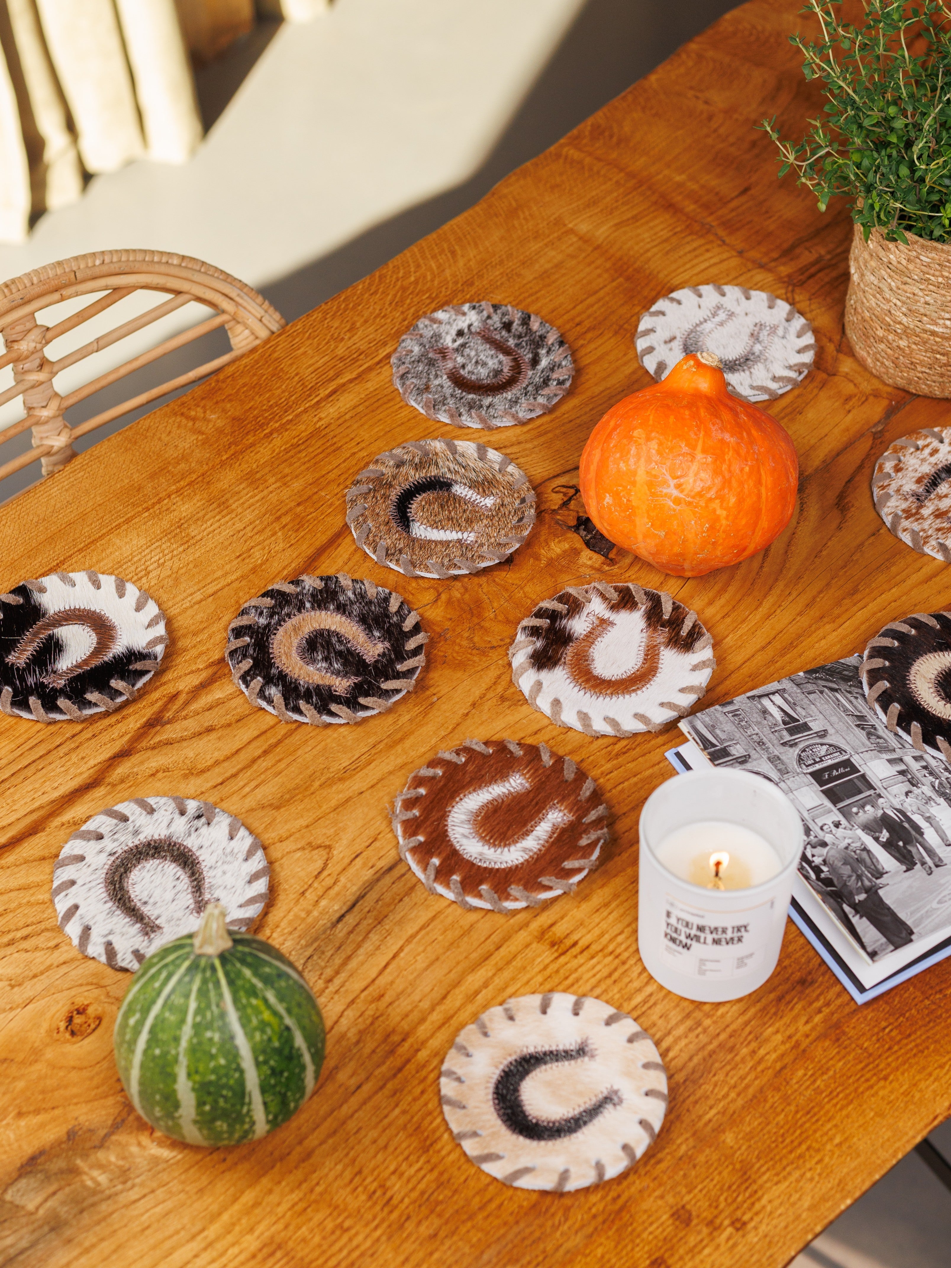 Ett litet, handgjort tillskott som förenar funktion och personlighet. Underläggen är tillverkade av äkta koskinn. Varje exemplar har sitt eget mönster och sin egen nyans, och ger ett varmt, naturligt och unikt inslag i hemmet. Perfekt för att skydda bord och bänkar från värme och fukt, eller som en liten dekorativ detalj som tillför charm var du än placerar dem.