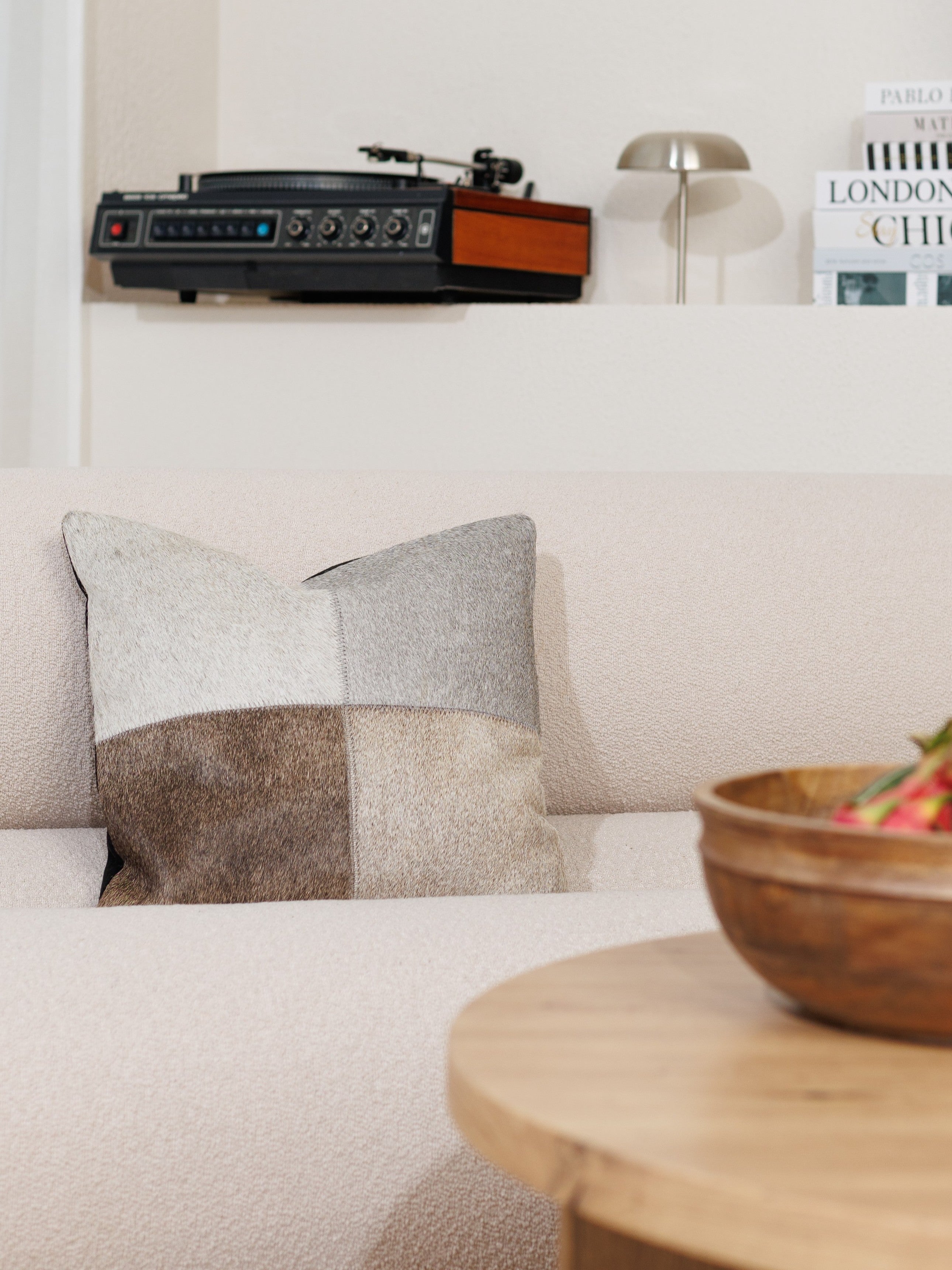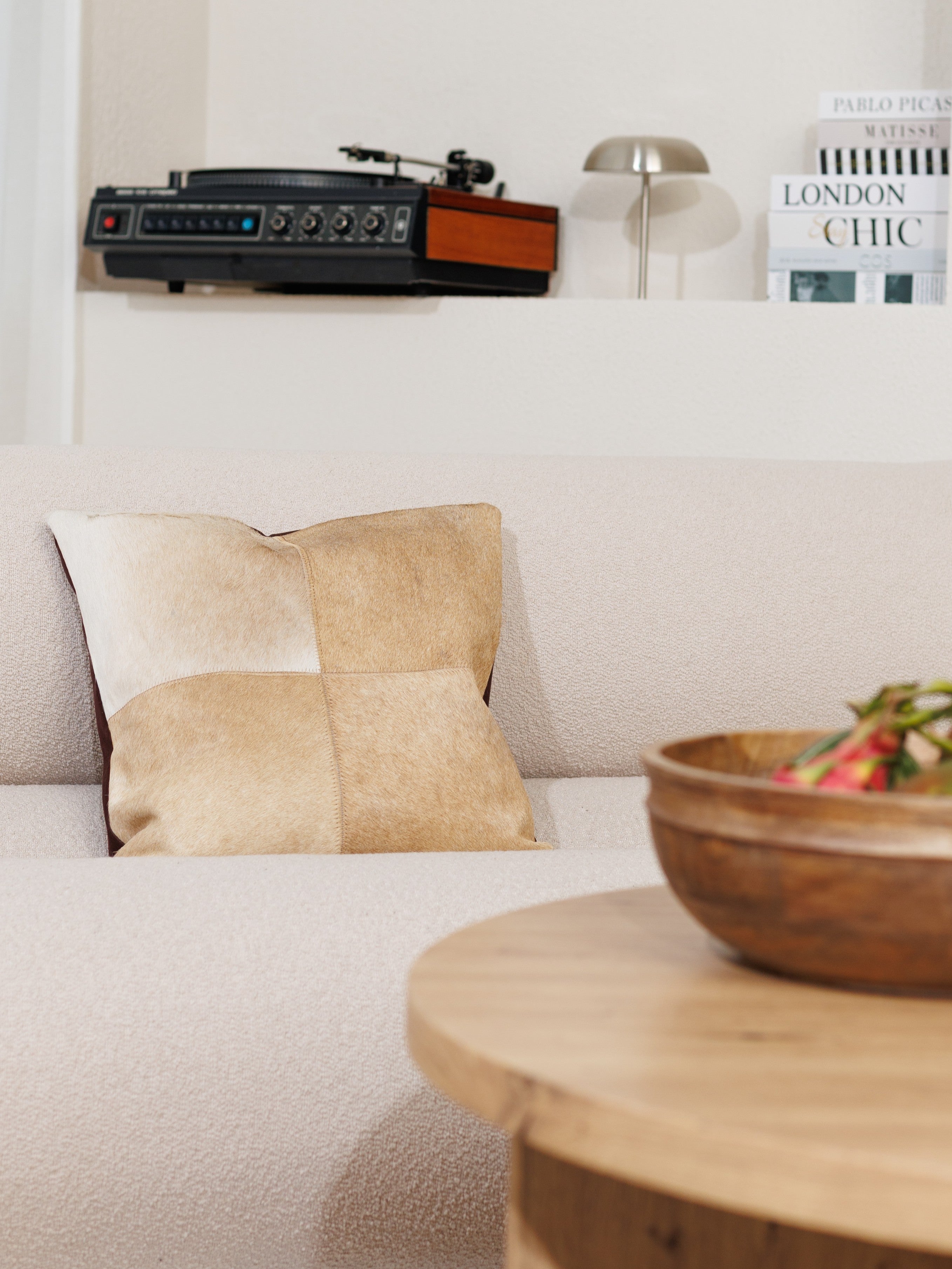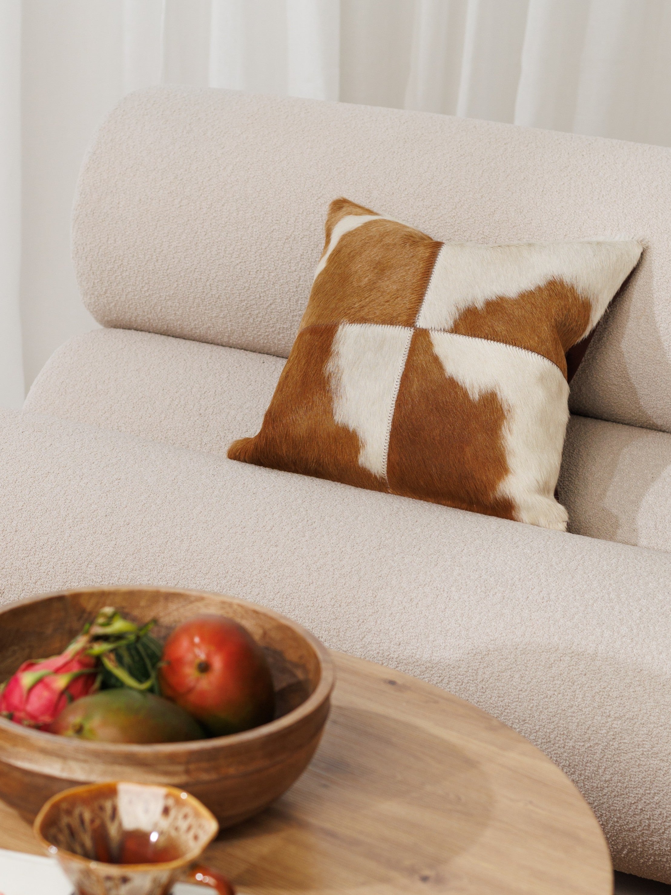 Varje kudde är handgjord av fyra paneler av äkta koskinn och får därför sin egen unika karaktär. Det mjuka, naturliga håret och de jordnära nyanserna gör den till en perfekt detalj i allt från mysiga vardagsrum och ombonade sovrum till lugna avkopplingsmiljöer.