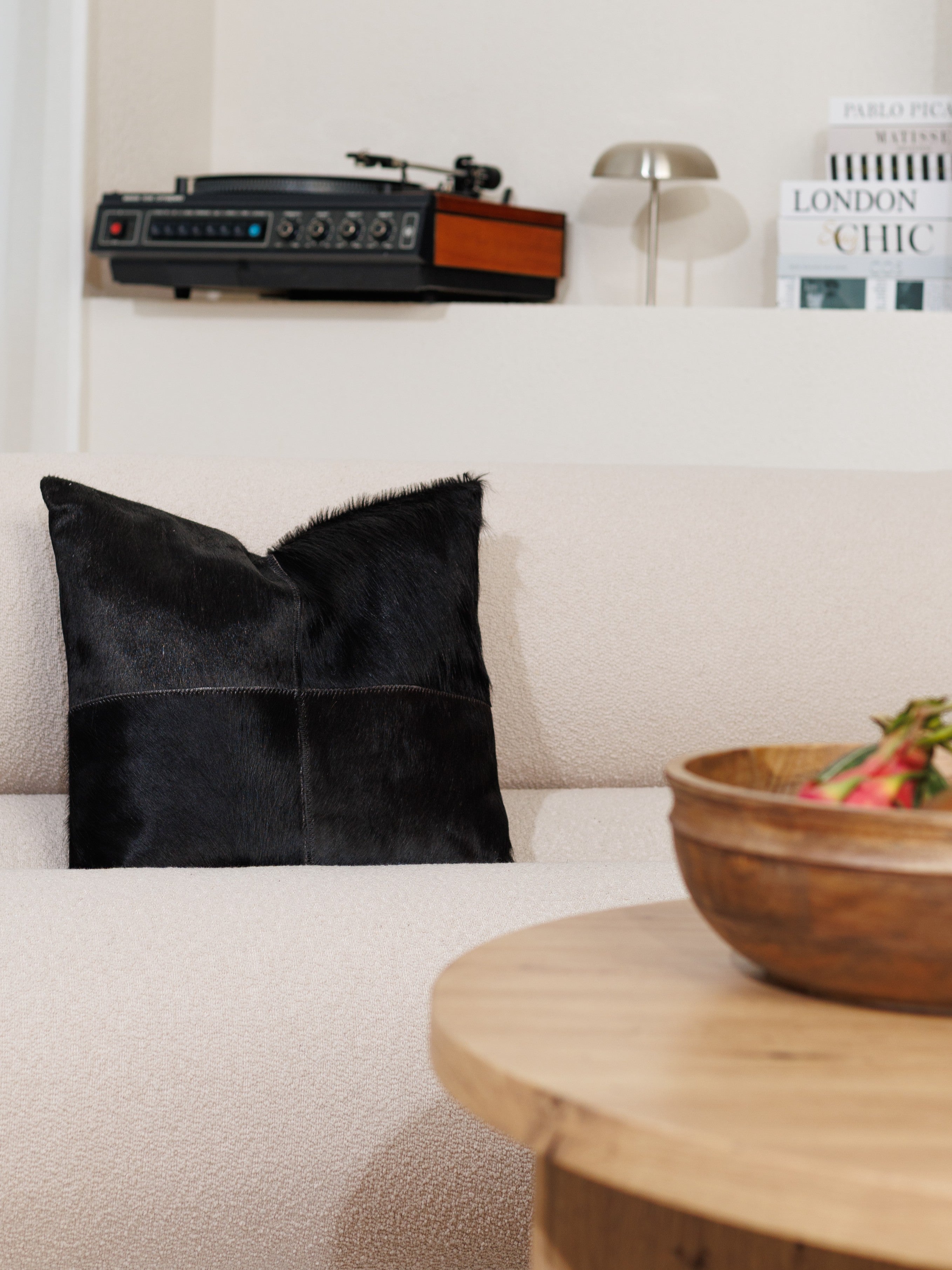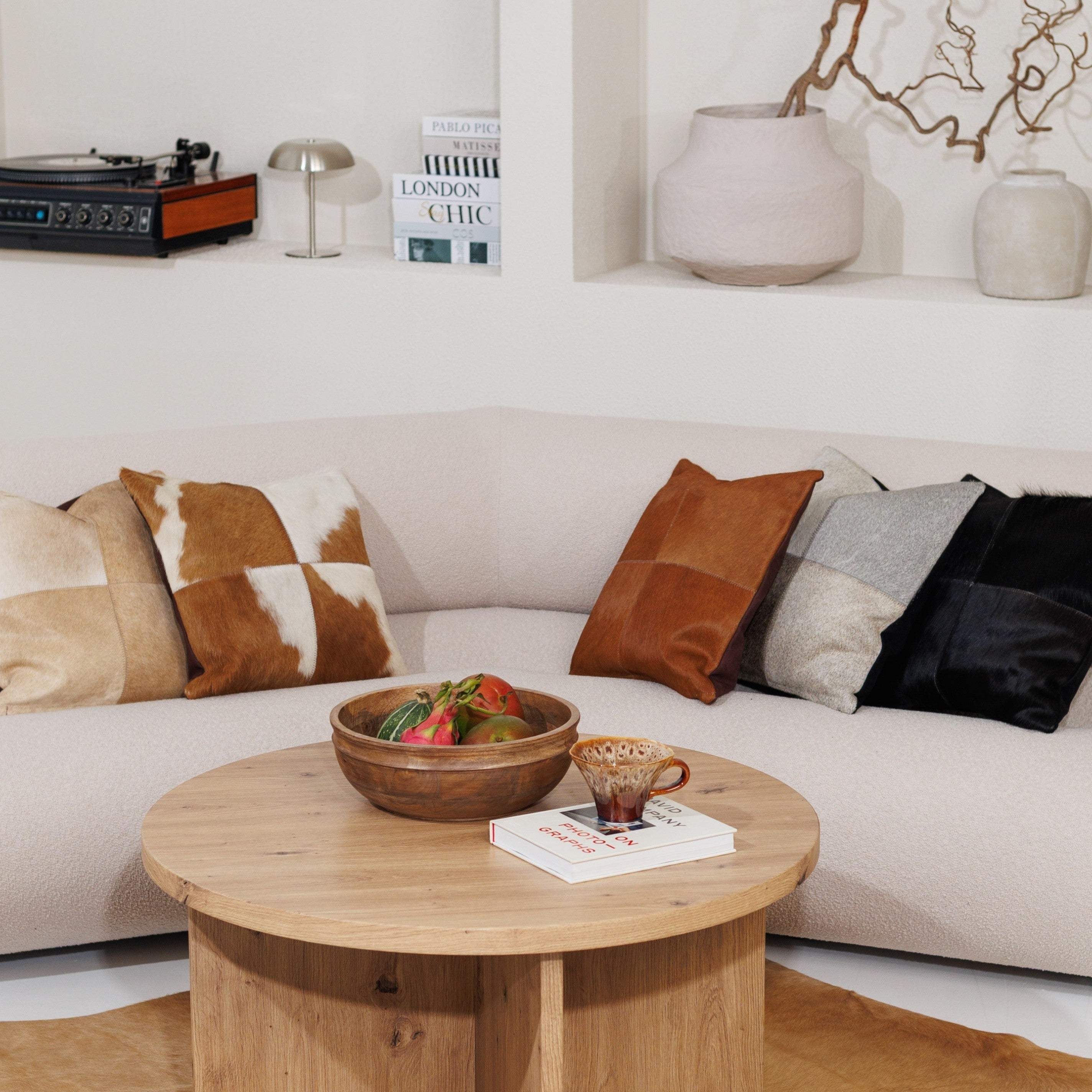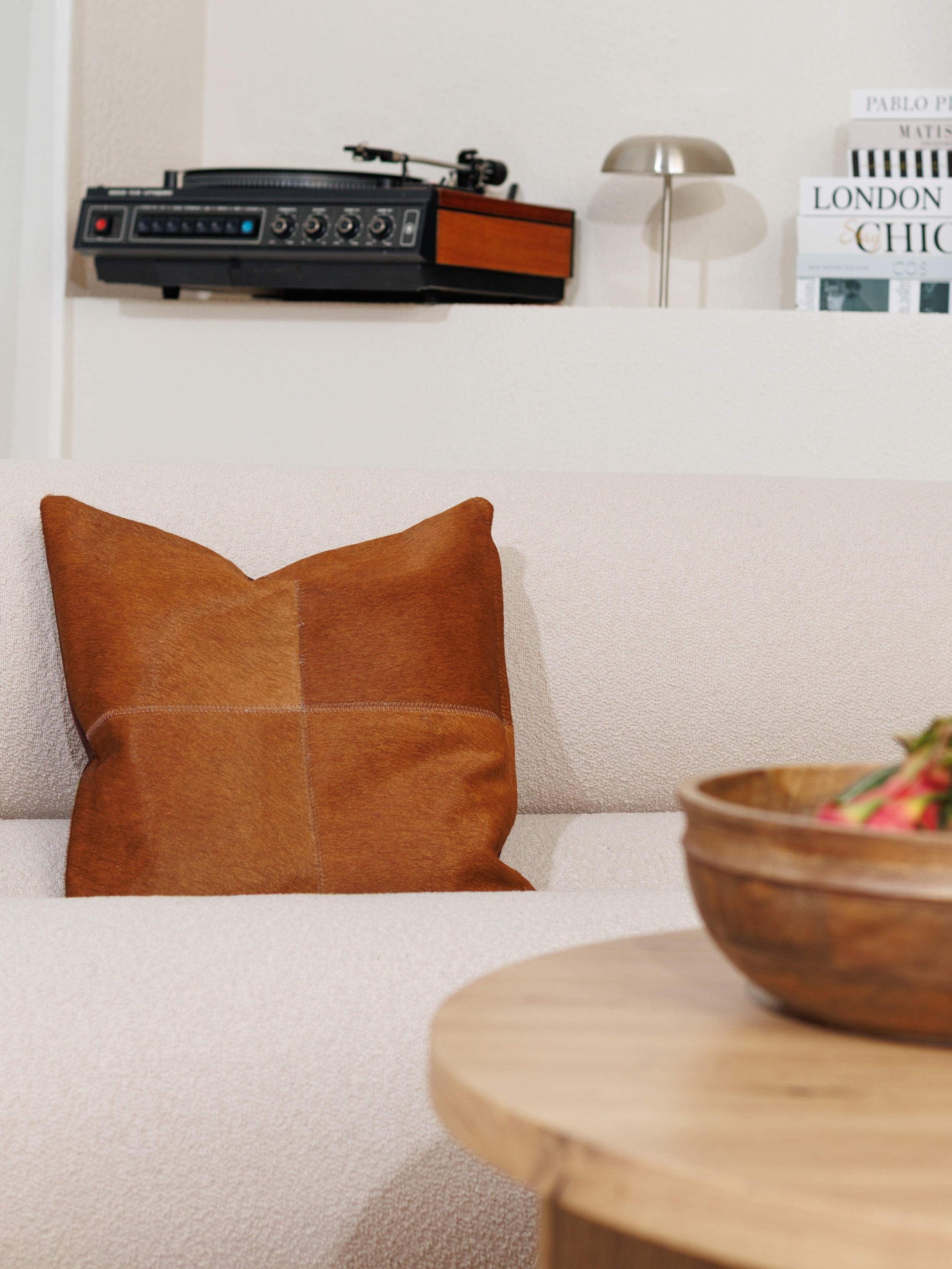 Varje kudde är handgjord av fyra paneler av äkta koskinn och får därför sin egen unika karaktär. Det mjuka, naturliga håret och de jordnära nyanserna gör den till en perfekt detalj i allt från mysiga vardagsrum och ombonade sovrum till lugna avkopplingsmiljöer.